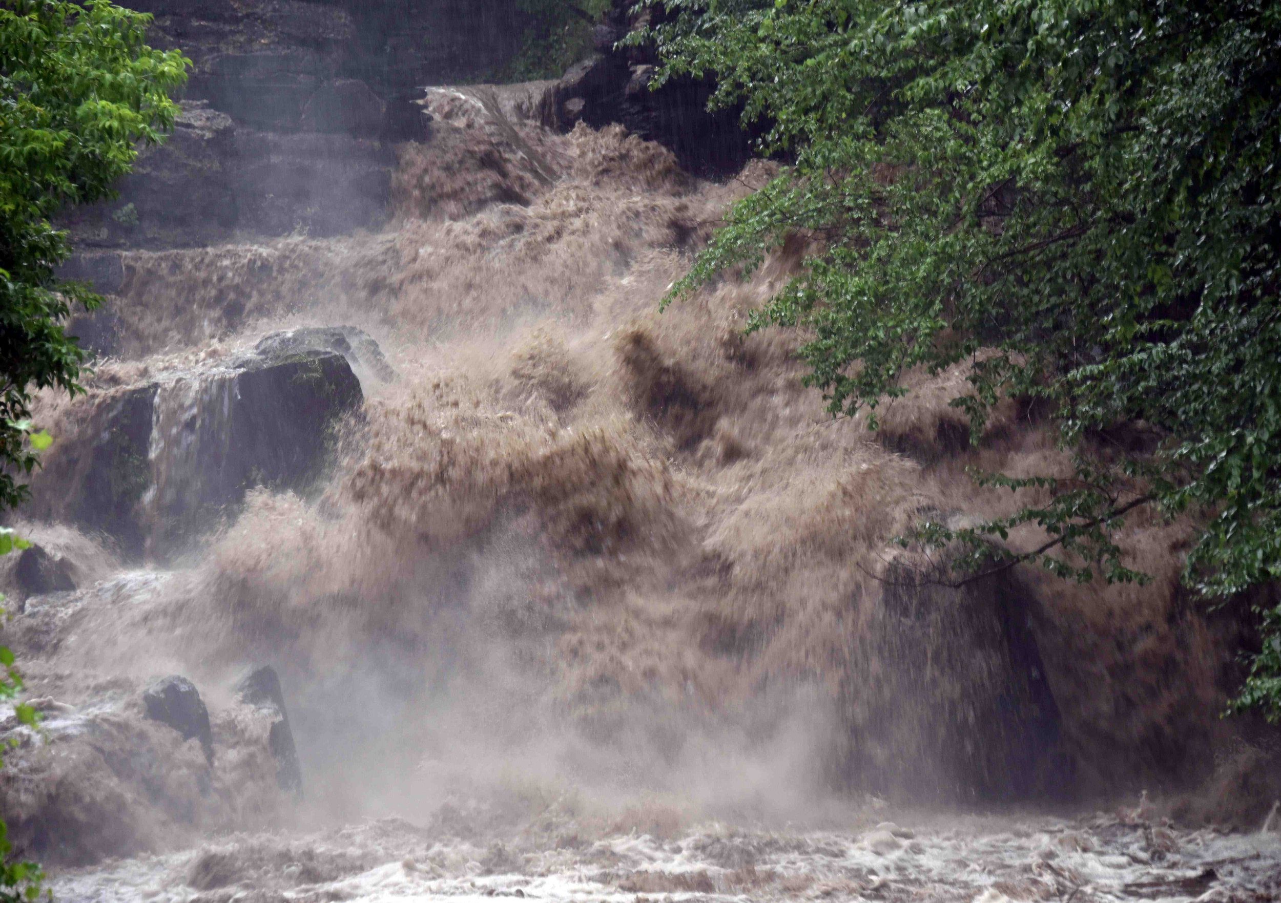 The Thatcher Brook crashes over the old dam just above Shaw’s supermarket early evening on Wednesday, July 10. Photo by Gordon Miller