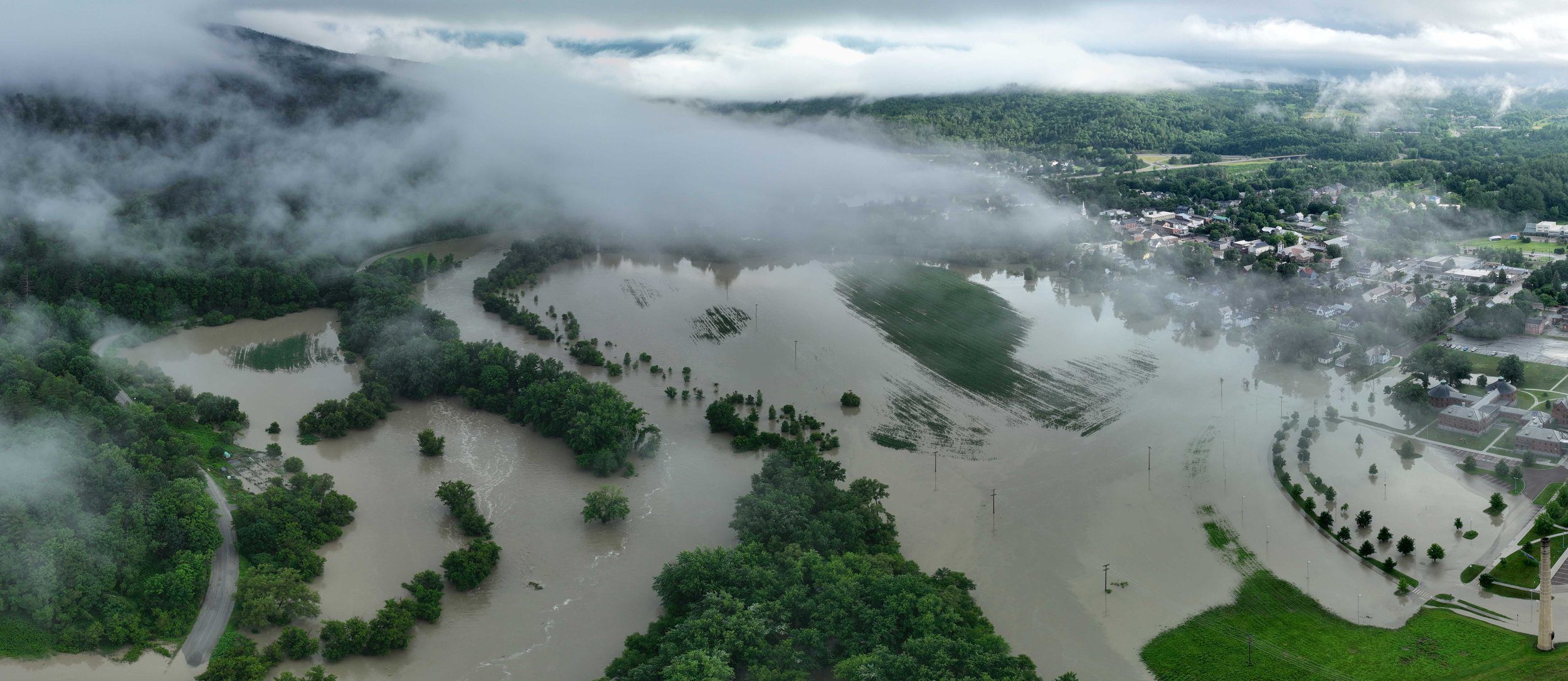 Fog lifts over the Winooski River and downtown Waterbury on Thursday morning, July 11. Photo by Gordon Miller