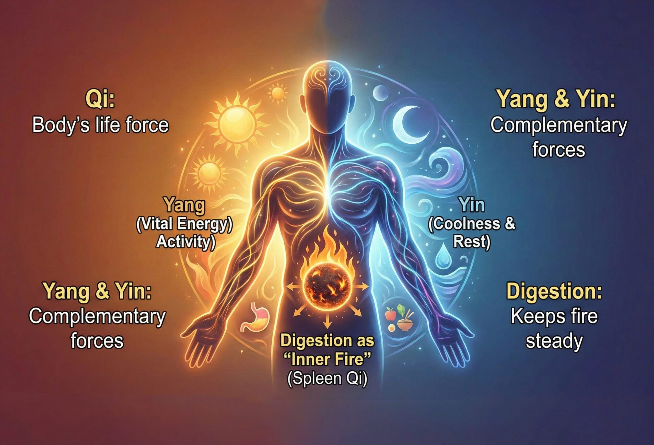 - Digestion as “Inner Fire”: TCM views digestion as a kind of internal fire (Spleen Qi). Keeping this fire steady helps the body process food, absorb nutrients, and maintain warmth—especially important in cold weather.