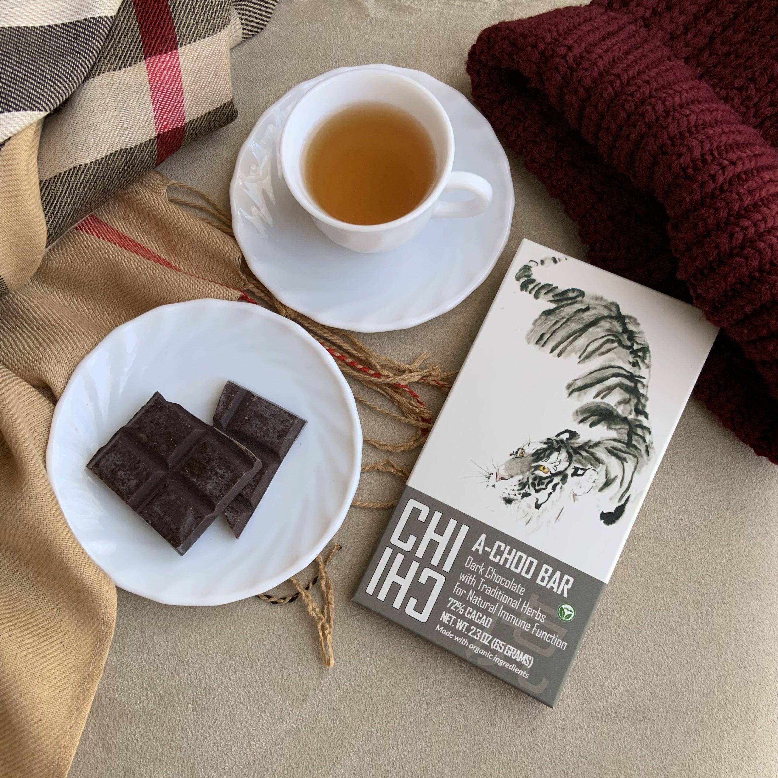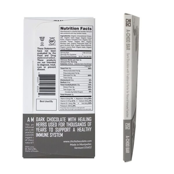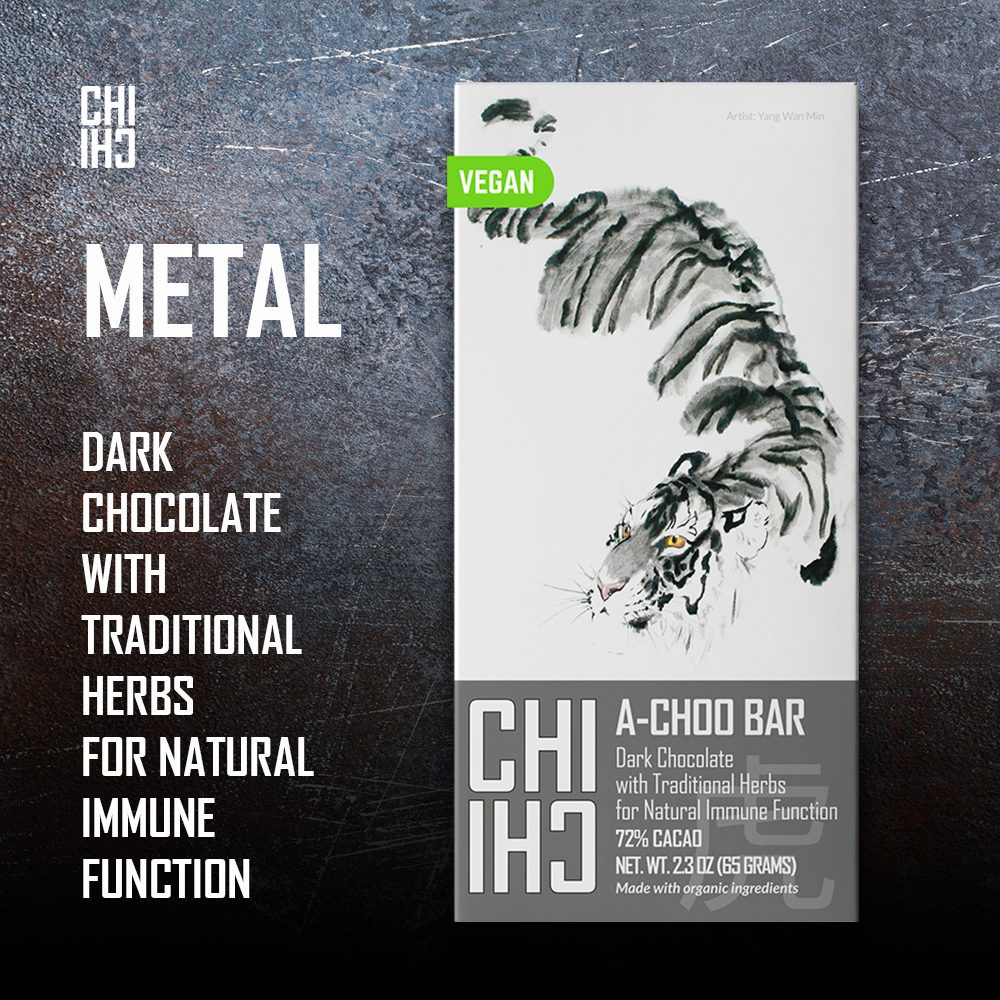 The herbs in this dark chocolate bar strengthen and Tonify lung Qi. They also boost the body’s Wei Qi or natural immune function. The A-Choo bar aligns with Metal element however, it can be useful for everyone.